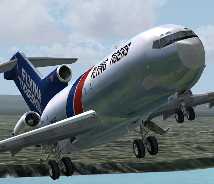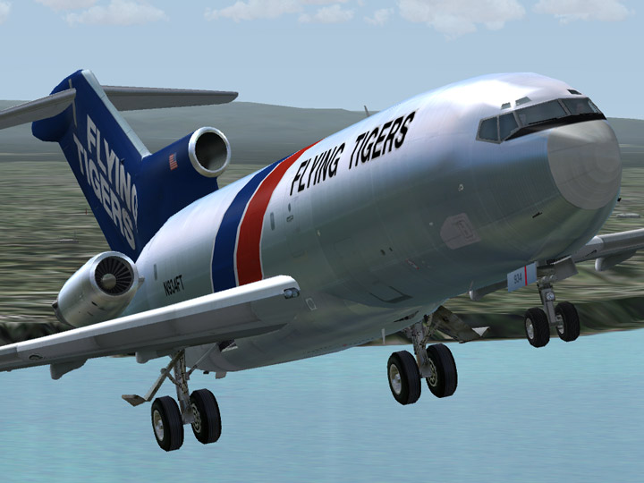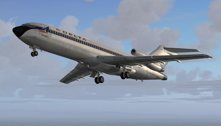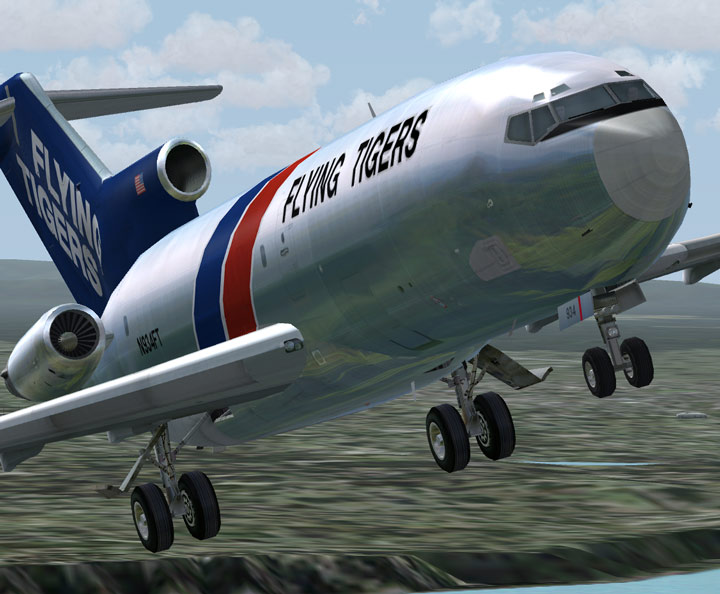 I want to take this a step farther, so I return to Photoshop, and add some additional Gaussion Blur filter, and also desaturate the green in the lower part of the image, being careful to keep the blues on the horizon area, and resave with DTXbmp. Back in FS2004, now the 727 seems a bit less polished, but still you can see some terrain forms below, and a nice horizon line.