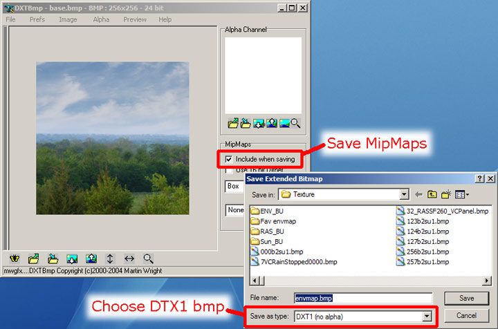 Here's a shot of DTXbmp, available for download here, where I'm saving a digital photo I've cropped to the proper size using Photoshop. I'm saving in extended .bmp format, DTX1 settings, and including mipmaps.