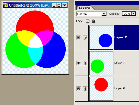 The RGB color model allows the intensities of these three colors to be mixed in an additive way, so that when full intensity red, green, and blue are overlayed we get white. When we try this in our graphics program, we can see this result using layer blending modes. Making a three layer image, paint pure red (255,0,0), green (0,255,0), and blue (0,0,255) onto one layer each. Now set the top two layers' blending modes to "lighten" (for Adobe Photoshop) and see what you get. Notice below that the three layers are only red, green, and blue. Where they all overlap white is show, where only two layers overlap, the additives for those layers are shown.