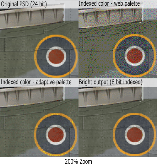 There are often questions about the program called BRIGHT which does color depth conversion independantly from the tools built into graphics software, either as a plugin or standalone. The BRIGHT program appears to make better judgments during selecting colors when creating the optimized 8-bit palette, though banding can still occur in images with very wide spectrum of colors. BRIGHT also seems to do a very good job on dither patters, which makes even better use of the good palette building. Doing some comparisions with your own graphics software converter will let you decide for yourself if BRIGHT helps in your work.