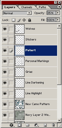 Another function that will be not mentioned below is the merging of layers. You can make another layer to do one thing, then merge it with another to "flatten" or combine the effect you desire. Keep in mind that Photoshop resets a layer from Multiply to Normal. "Multiply" is a neat effect to use in most cases, as it makes that layer pretty much more transparent. Normal is just that, normal. These are selectable between different layers, and recommended in some cases. The "New Camo Pattern" is a multiplied effect, and I had to erase portions of another layer to get the effect below.